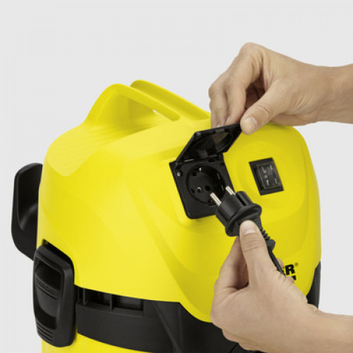 Енергоефективний апарат WD 3 P V-17/4/20 розвиває високу силу всмоктування при низькій споживаній потужності (лише 1000 Вт). При цьому він оптимально поєднується з всмоктувальним шлангом і з насадкою для підлоги, завдяки чому забезпечуються чудові результати збору будь-якого сміття - сухого або вологого, великого або дрібного. Цей господарський пилосос, що вражає своєю компактністю, оснащений міцним 17-літровим пластиковим сміттєзбірником, 4-метровим кабелем, 2-метровим всмоктувальним шлангом і фільтр-мішком з нетканого матеріалу. Завдяки нерозбірному патронному фільтру він дозволяє змінювати операції вологого та сухого прибирання без заміни фільтра. Вбудована штепсельна розетка з автоматикою вмикання/відключення дозволяє підключати до нього електроінструменти (лобзики, шліфувальні машини тощо) для негайного збирання пилу та стружки, що утворюються під час виконання робіт з ними. Функція видування значно полегшує очищення важкодоступних місць. Для компактного зберігання апарата шланг підвішується на моторній частині, кабель – на спеціальному гаку, а подовжувальні трубки та насадка для підлоги закріплюються на відбійнику. Замки Pull & Push дозволяють дуже легко приєднувати та від'єднувати сміттєзбірник. Рукоятка може зніматися з всмоктувального шланга для прикріплення насадок безпосередньо до нього.